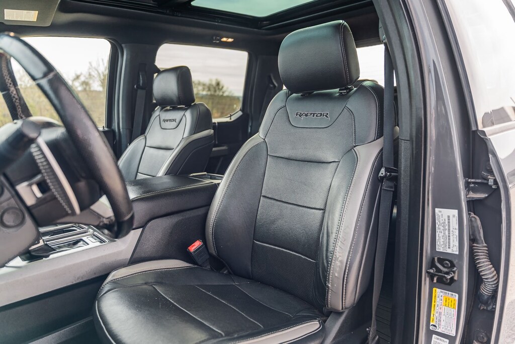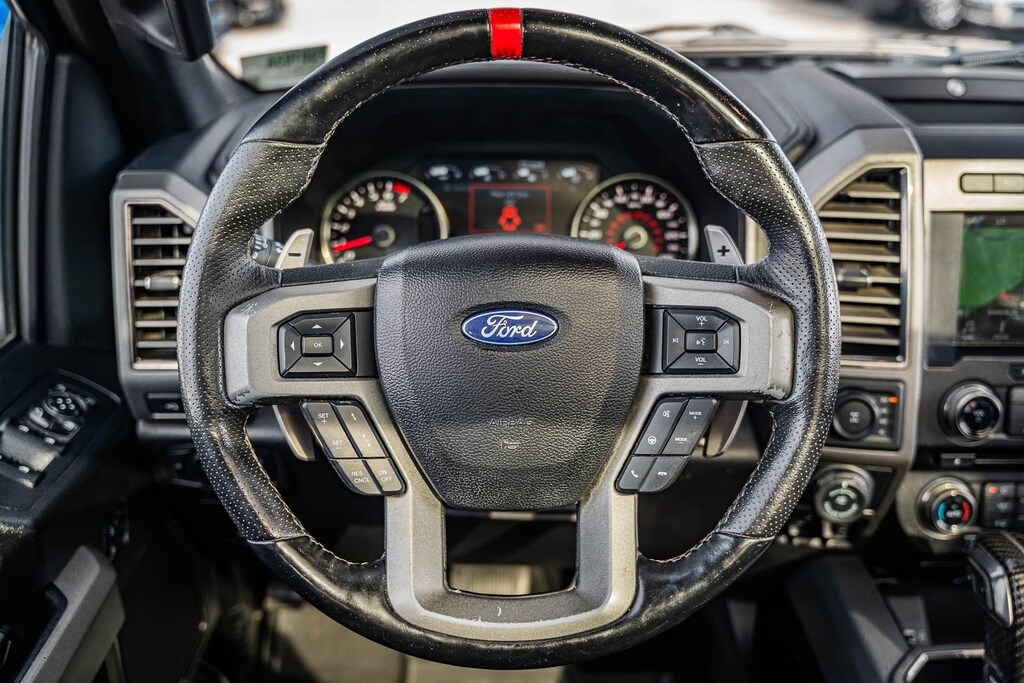 This vehicle comes equipped with Equipment Group 802A Luxury (10-Way Power Driver & Passenger Seats, 360 Degree Camera, 4.10 Front Axle w/Torsen Differential, 8" Productivity Screen, Advanced Security Pack, Ambient Lighting - Ice Blue Color Only, BLIS Blind Spot Information System, Dual-Zone Electronic Automatic Temperature Control, Heated Steering Wheel, Inflatable Rear Safety Belts, Integrated Trailer Brake Controller, Intelligent Access w/Push-Button Start, LED Box Lighting, LED Sideview Mirror Spotlights, Memory System (Seat, Pedal, Exterior Mirror), Power Glass Heated Sideview Mirrors, Power Tilt/Telescoping Steering Column w/Memory, Power-Adjustable Pedals, Power-Sliding Rear Window, Pro Trailer Backup Assist, Radio: B&O Play Premium Audio System, Remote Start System w/Remote Tailgate Release, SYNC 3, SYNC Connect, Tailgate Applique FORD, Universal Garage Door Opener, and Voice-Activated Touchscreen Navigation System), GVWR: 7,050 lbs Payload Package, Raptor Carbon Fiber Package (Unique Carbon Fiber Shift Knob), Raptor Exterior Graphics Package, Raptor Hood Graphics Package, Raptor Technology Package (Adaptive Cruise Control w/Collision Mitigation, Auto High Beam, and Lane-Keeping System), Ford Certified, 4WD, 17" Cast Aluminum Wheels, 17" Forged Aluminum Bead-Lock Capable Wheels, 4-Wheel Disc Brakes, 7 Speakers, 8-Way Power Driver's Seat w/Power Lumbar, ABS brakes, Air Conditioning, Alloy wheels, AM/FM radio: SiriusXM, Auto-dimming Rear-View mirror, Brake assist, CD player, Compass, Delay-off headlights, Driver door bin, Driver vanity mirror, Dual front impact airbags, Dual front side impact airbags, Electronic Locking w/4.10 Axle Ratio, Electronic Stability Control, Emergency communication system: 911 Assist, Exterior Parking Camera Rear, Foldable Pickup Box Bed Extender, Front anti-roll bar, Front Bucket Seats, Front Center Armrest, Front fog lights, Front reading lights, Front wheel independent suspension, Fully automatic headlights, Heated Leather 40/Console/40 Front Seats, Illuminated entry, Leather steering wheel, Low tire pressure warning, Occupant sensing airbag, Outside temperature display, Overhead airbag, Overhead console, Panic alarm, Passenger door bin, Passenger vanity mirror, Power door mirrors, Power driver seat, Power steering, Power windows, Radio data system, Rear Parking Sensors, Rear reading lights, Rear step bumper, Rear window defroster, Remote keyless entry, Security system, Speed control, Speed-sensing steering, Split folding rear seat, Spray-In Bedliner (Pre-Installed), Steering wheel mounted audio controls, SYNC, Tachometer, Tailgate Step w/Tailgate Lift Assist, Telescoping steering wheel, Tilt steering wheel, Traction control, Trip computer, Twin Panel Moonroof, Unique Cloth Trim Seats, and Variably intermittent wipers.