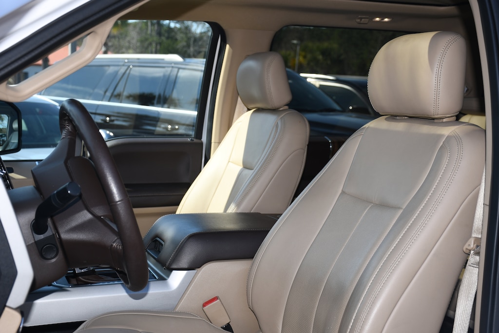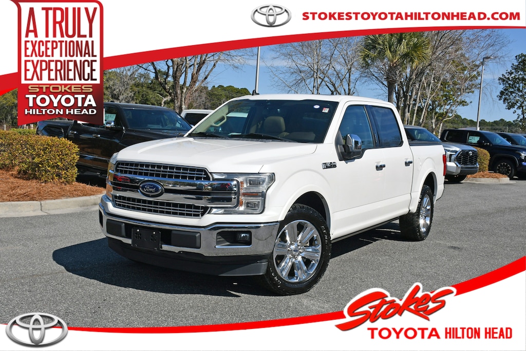 ***Stokes Toyota Hilton Head*** 2019 Ford F-150 Lariat in White Platinum, Factory Equipped With: 110V/400W Outlet, 2nd Row Heated Seats, Active Park Assist, BLIS Blind Spot Information System, Chrome 2-Bar Grille w/4 Minor Bars, Chrome Angular Step Bars, Chrome Door & Tailgate Handles w/Body-Color Bezel, Chrome Skull Caps on Exterior Mirrors, Equipment Group 502A Luxury, Heated Steering Wheel, Lane-Keeping System, Lariat Chrome Appearance Package, Leather-Trimmed Bucket Seats, LED Sideview Mirror Spotlights, Power Glass Sideview Mirr w/Chrome Skull Caps, Power Tilt/Telescoping Steering Column w/Memory, Quad Beam LED Headlamps & LED Taillamps/Fog Lamps, Radio: B&O Sound System by Bang & Olufsen, Rain-Sensing Wipers, Remote Start System w/Remote Tailgate Release, Reverse Sensing System, Single-Tip Chrome Exhaust, Technology Package, Universal Garage Door Opener, Wheels: 20" Chrome-Like PVD, Windshield Wiper De-Icer. Clean CARFAX. Professionally Serviced and Detailed for your Peace of Mind. CALL US TODAY FOR MORE DETAILS OR TO SCHEDULE A TEST DRIVE AT 843.815.0240 OR VISIT US ON THE WEB AT WWW.STOKESTOYOTAHILTONHEAD.COM OR VISIT US AT 100 FORDING ISLAND ROAD, BLUFFTON SC 29910.