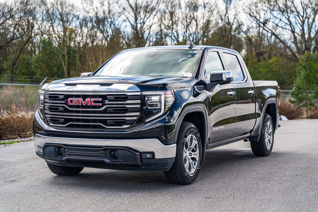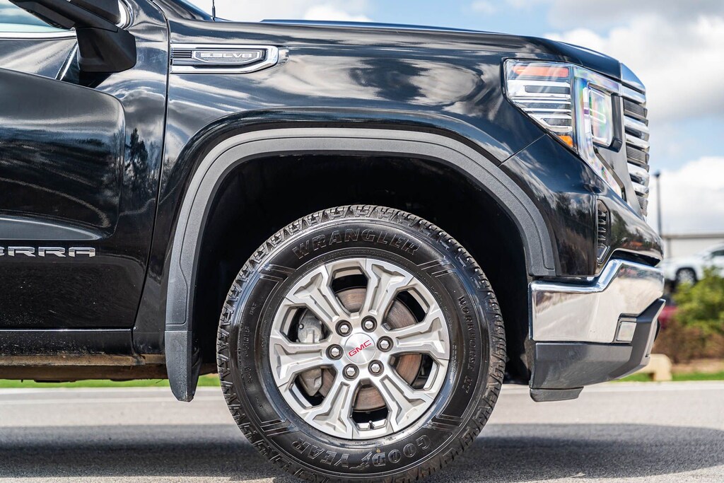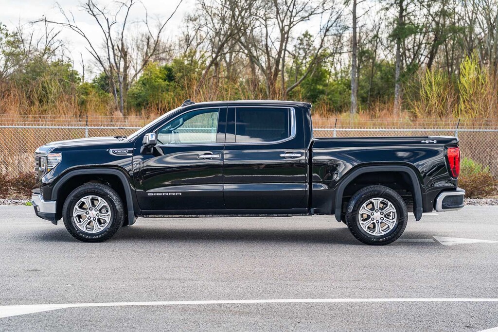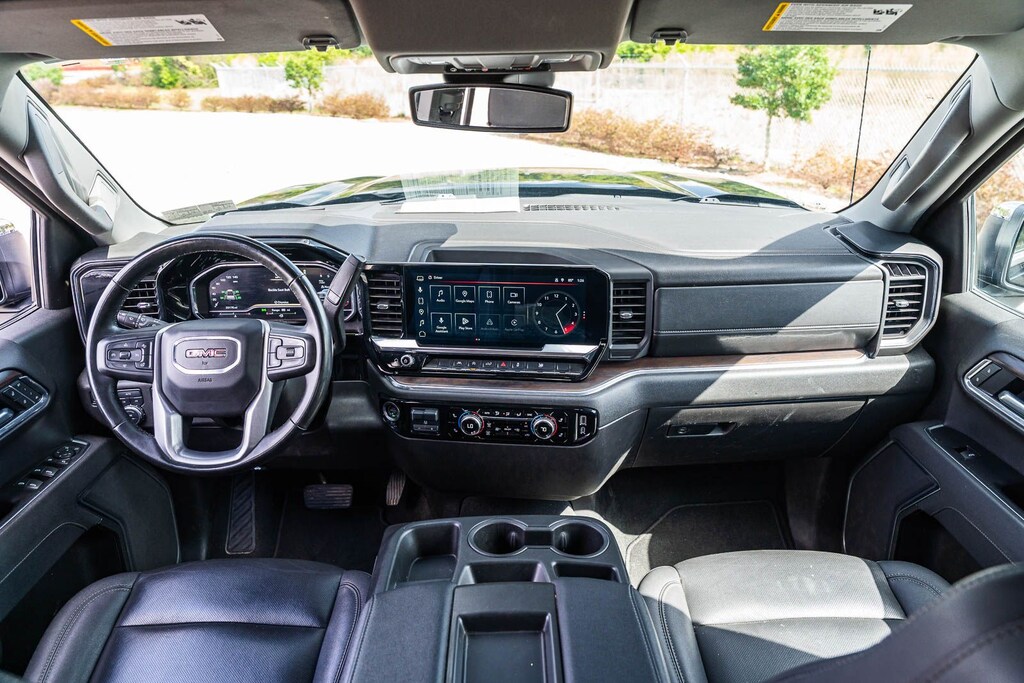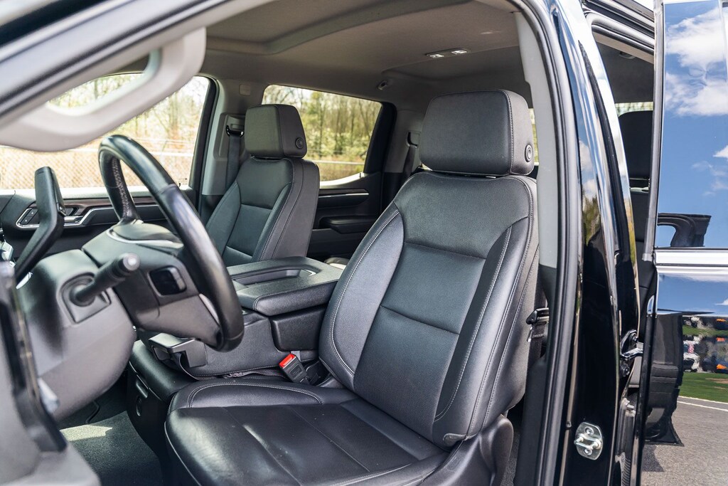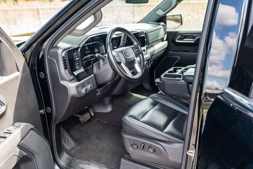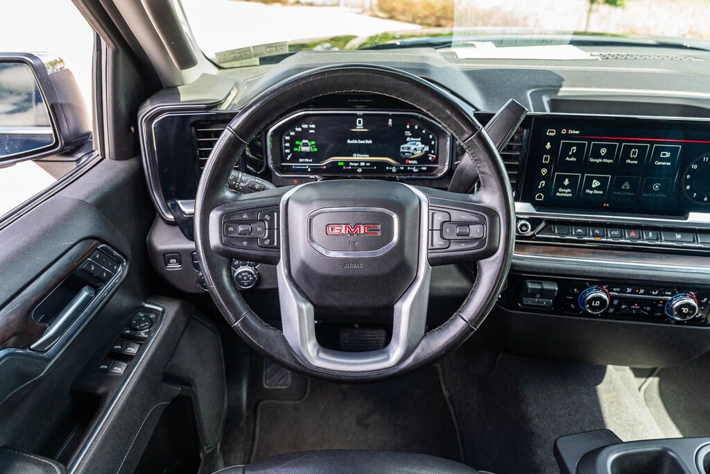 This Sierra 1500 SLT includes Preferred Equipment Group 4SA (120-Volt Bed Mounted Power Outlet, 120-Volt Interior Power Outlet, 170 Amp Alternator, 2 Charge/Data USB Ports, 2 Type-C Charge-Only Rear USB Ports, 6-Speaker Audio System Feature, Auto-Locking Rear Differential, Auxiliary External Transmission Oil Cooler, Chrome Header & Chrome Grille Insert Bars, Color-Keyed Carpeting Floor Covering, Deep-Tinted Glass, Electric Rear-Window Defogger, Front Frame-Mounted Black Recovery Hooks, Front Rain-Sensing Wipers, HD Rear Vision Camera, Integrated Trailer Brake Controller, Keyless Open & Start, LED Cargo Area Lighting, Manual Tilt-Wheel & Telescoping Steering Column, OnStar Services Capable, Perimeter Lighting, Power Door Locks, Power Front Passenger Windows w/Express Up/Down, Power Front Windows w/Driver Express Up/Down, Power Rear Windows w/Express Down, Push Button Start, Rear Wheelhouse Liners, Remote Vehicle Starter System, SiriusXM w/360L Trial Subscription, Steering Wheel Audio Controls, Theft Deterrent System (Unauthorized Entry), and Wi-Fi Hotspot Capable), Standard Suspension Package, Trailering Package (Hitch Guidance), 10-Speed Automatic, 4WD, Black Leather, 10-Way Power Driver Seat Adjuster w/Lumbar, 10-Way Power Passenger Seat Adjuster w/Lumbar, 3.23 Rear Axle Ratio, 4-Wheel Disc Brakes, 6 Speakers, ABS brakes, Air Conditioning, Alloy wheels, AM/FM radio: SiriusXM with 360L, Apple CarPlay/Android Auto, Auto High-beam Headlights, Auto-dimming door mirrors, Auto-dimming Rear-View mirror, Automatic Emergency Braking, Automatic temperature control, Brake assist, Buckle to Drive, Bumpers: chrome, Compass, Delay-off headlights, Driver door bin, Driver Memory, Driver vanity mirror, Dual front impact airbags, Dual front side impact airbags, Electronic Stability Control, Emergency communication system: OnStar, Following Distance Indicator, Forward Collision Alert, Front 40/20/40 Split-Bench Seat, Front anti-roll bar, Front Center Armrest w/Storage, Front dual zone A/C, Front fog lights, Front Pedestrian Braking, Front reading lights, Front wheel independent suspension, Fully automatic headlights, Heated door mirrors, Heated Driver & Front Outboard Passenger Seating, Heated front seats, Heated steering wheel, Illuminated entry, IntelliBeam Automatic High Beam On/Off, Lane Keep Assist w/Lane Departure Warning, Low tire pressure warning, Memory seat, Navigation System, Occupant sensing airbag, Outside temperature display, Overhead airbag, Overhead console, Panic alarm, Passenger door bin, Passenger vanity mirror, Perf Leather-Appointed Front Outboard Seat Trim, Power door mirrors, Power driver seat, Power passenger seat, Power steering, Power windows, Radio data system, Radio: Premium GMC Infotainment Audio System, Rain sensing wipers, Rear reading lights, Rear seat center armrest, Rear step bumper, Rear window defroster, Remote keyless entry, Security system, Speed control, Speed-sensing steering, Split folding rear seat, Steering wheel mounted audio controls, Tachometer, Telescoping steering wheel, Tilt steering wheel, Traction control, Trip computer, Variably intermittent wipers, Voltmeter, Wheels: 18" x 8.5" 6-Spoke Machined Aluminum, and Wireless Apple CarPlay/Wireless Android Auto . While every effort has been made to ensure display of accurate data, the vehicle listings within this web site may not reflect all accurate vehicle items. All Inventory listed is subject to prior sale. The vehicle photo displayed may be an example only. Pricing throughout the web site does not include any options that may have been installed at the dealership. Please see the dealer for details. Vehicles may be in transit or currently in production. Some vehicles are shown with optional equipment. See the actual vehicle for complete accuracy of features, options & pricing. Because of th