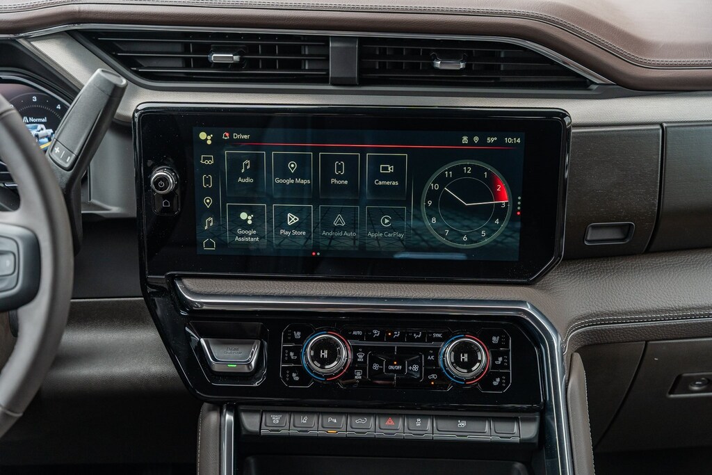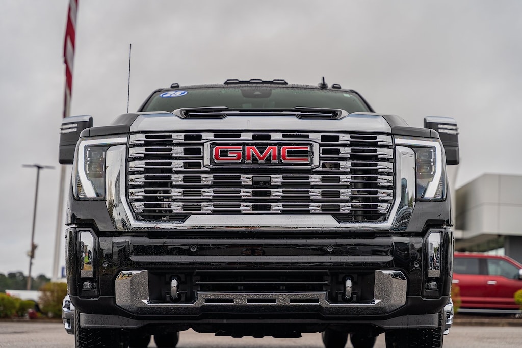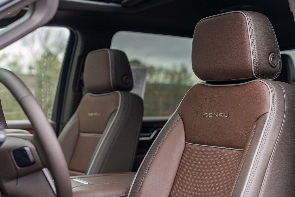 This vehicle comes equipped with Denali Reserve Package (Power Sunroof), Gooseneck/5th Wheel Prep Package, Preferred Equipment Group 5SA (120-Volt Bed Mounted Power Outlet, 120-Volt Instrument Panel Power Outlet, 2 Charge-Only Rear USB Ports, 2 Charge/Data USB Ports Inside Center Console, 2 USB Ports, 2-Speed Active Transfer Case, Bed View Camera w/2 Trailer Camera Provisions, Bose Premium 7-Speaker Sound System, Deep-Tinted Glass, Electric Rear-Window Defogger, Floor-Mounted Center Console, Front Rain-Sensing Wipers, HD Surround Vision, Heated 2nd Row Outboard Seats, Heated Driver & Front Outboard Passenger Seats, Keyless Open & Start, LED Cargo Area Lighting, LED Smoked Amber Roof Marker Lamps, Manual Tilt-Wheel/Telescoping Steering Column, Polished Exhaust Tip, Power Front Windows w/Passenger Express Up/Down, Power Sliding Rear Window w/Defogger, Push Button Start, Rear Cross Traffic Alert, Remote Vehicle Starter System, Safety Alert Seat, Signature Chrome Denali Grille, SiriusXM w/360L Trial Subscription, Spray-On Pickup Bedliner w/GMC Logo, Steering Wheel Audio Controls, Trailer Camera Provisions, Trailer Side Blind Zone Alert, Ultrasonic Front & Rear Park Assist, Unauthorized Entry Theft-Deterrent System, Universal Home Remote, Ventilated Driver & Front Passenger Seats, Wireless Charging, and Wireless Phone Projection), Technology Package (Auto-Dimming Inside Rearview Mirror w/Camera and Multicolor 15" Diagonal Head-Up Display), 10-Speed Automatic, 4WD, Atmosphere/Brownstone Leather, 12-Way Power Driver Seat Adjuster w/Lumbar, 12-Way Power Passenger Seat Adjuster w/Lumbar, 220 Amp Alternator, 3.42 Rear Axle Ratio, 3.73 Rear Axle Ratio, 4-Wheel Disc Brakes, 7 Speakers, ABS brakes, Air Conditioning, Alloy wheels, AM/FM radio: SiriusXM with 360L, Auto High-beam Headlights, Auto-dimming door mirrors, Auto-dimming Rear-View mirror, Automatic Emergency Braking, Automatic temperature control, Brake assist, Buckle to Drive, Bumpers: body-color, Compass, Delay-off headlights, Driver door bin, Driver Memory, Driver vanity mirror, Dual front impact airbags, Dual front side impact airbags, Electronic Stability Control, Engine Block Heater, Exhaust Brake, Exterior Parking Camera Rear, Following Distance Indicator, Forge Perforated Leather Seat Trim, Forward Collision Alert, Front anti-roll bar, Front Bucket Seats, Front Center Armrest, Front dual zone A/C, Front fog lights, Front Pedestrian Braking, Front reading lights, Front wheel independent suspension, Fully automatic headlights, Garage door transmitter, Genuine wood dashboard insert, Genuine wood door panel insert, GMC Premium 13.4" Diagonal Information Display, Heated door mirrors, Heated front seats, Heated rear seats, Heated steering wheel, Heavy-Duty 80 Amp-Hr Battery, Hitch Guidance w/Hitch View, Illuminated entry, IntelliBeam Automatic High Beam On/Off, Lane Departure Warning System, Low tire pressure warning, Memory seat, Occupant sensing airbag, Outside temperature display, Overhead airbag, Overhead console, Panic alarm, Passenger door bin, Passenger vanity mirror, Pickup Bed, Power door mirrors, Power driver seat, Power passenger seat, Power steering, Power windows, Power-Retractable Assist Steps, Radio: AM/FM w/Premium GMC Infotainment System, Rain sensing wipers, Rear reading lights, Rear seat center armrest, Rear step bumper, Rear window defroster, Remote keyless entry, Security system, Speed control, Speed-sensing steering, Split folding rear seat, Steering wheel mounted audio controls, Tachometer, Telescoping steering wheel, Tilt steering wheel, Traction control, Trip computer, Turn signal indicator mirrors, Variably intermittent wipers, Ventilated front seats, Voltmeter, and Winter Grille Cover.