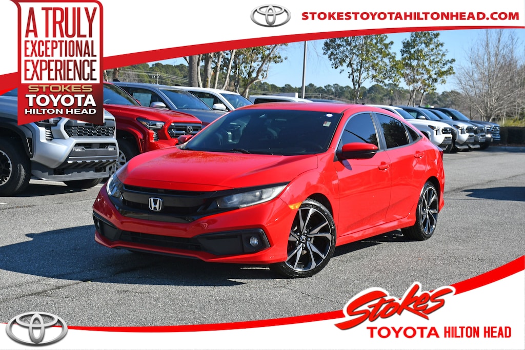 ***Stokes Toyota Hilton Head*** 2019 Honda Civic Sport in Rallye Red, Factory Equipped With: Power Windows, Power Locks, Cruise Control, Remote Keyless Entry, Integrated Back Up Camera, Alloy Wheels, 8 Speakers, ABS brakes, Air Conditioning, AM/FM radio, Apple CarPlay/Android Auto, Auto High-beam Headlights, Automatic temperature control, Brake assist, Bumpers: body-color, Cloth Seat Trim, Dual front impact airbags, Dual front side impact airbags, Electronic Stability Control, Exterior Parking Camera Rear, Front Bucket Seats, Front fog lights, Low tire pressure warning, Outside temperature display, Power door mirrors, Power steering, Power windows, Remote keyless entry, Telescoping steering wheel, Tilt steering wheel, Trip computer, Wheels: 18" Alloy w/Gloss Black Inserts. Professionally Serviced and Detailed for your Peace of Mind. CALL US TODAY FOR MORE DETAILS OR TO SCHEDULE A TEST DRIVE AT 843.815.0240 OR VISIT US ON THE WEB AT WWW.STOKESTOYOTAHILTONHEAD.COM OR VISIT US AT 100 FORDING ISLAND ROAD, BLUFFTON SC 29910.