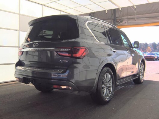 This QX80 LUXE includes Cargo Package (Cargo Net, Carpeted Cargo Mat, Center Console Tray, Console Net, and First-Aid Kit), Split Bench Seat Package, 13 Speakers, 2.937 Axle Ratio, 3rd row seats: split-bench, 4-Wheel Disc Brakes, ABS brakes, Air Conditioning, Alloy wheels, AM/FM radio: SiriusXM, Anti-whiplash front head restraints, Auto High-beam Headlights, Auto tilt-away steering wheel, Auto-dimming door mirrors, Auto-dimming Rear-View mirror, Auto-leveling suspension, Automatic temperature control, Brake assist, Bumpers: body-color, Compass, Delay-off headlights, Driver door bin, Driver vanity mirror, Dual front impact airbags, Dual front side impact airbags, Electronic Stability Control, Emergency communication system: INFINITI InTouch, Four wheel independent suspension, Front anti-roll bar, Front Bucket Seats, Front Center Armrest, Front dual zone A/C, Front fog lights, Front reading lights, Fully automatic headlights, Garage door transmitter: HomeLink, Heated door mirrors, Heated Front Bucket Seats, Heated front seats, Heated steering wheel, Illuminated entry, INFINITI Radiant Illuminated Kick Plates (N93), Leather Shift Knob, Leather steering wheel, Leather-Appointed Seats, Literature Kit, Low tire pressure warning, Memory seat, Navigation system: INFINITI InTouch Navigation, Occupant sensing airbag, Outside temperature display, Overhead airbag, Overhead console, Panic alarm, Passenger door bin, Passenger vanity mirror, Power door mirrors, Power driver seat, Power Liftgate, Power moonroof, Power passenger seat, Power steering, Power windows, Premium audio system: Bose, Radio data system, Radio: Bose Premium Audio System w/13 Speakers, Rain sensing wipers, Rear air conditioning, Rear anti-roll bar, Rear reading lights, Rear seat center armrest, Rear window defroster, Rear window wiper, Reclining 3rd row seat, Remote keyless entry, Security system, Speed control, Speed-sensing steering, Split folding rear seat, Spoiler, Steering wheel memory, Steering wheel mounted audio controls, Tachometer, Telescoping steering wheel, Tilt steering wheel, Traction control, Trip computer, Turn signal indicator mirrors, Variably intermittent wipers, Voltmeter, and Wheels: 20" x 8.0" Aluminum-Alloy . While every effort has been made to ensure display of accurate data, the vehicle listings within this web site may not reflect all accurate vehicle items. All Inventory listed is subject to prior sale. The vehicle photo displayed may be an example only. Pricing throughout the web site does not include any options that may have been installed at the dealership. Please see the dealer for details. Vehicles may be in transit or currently in production. Some vehicles are shown with optional equipment. See the actual vehicle for complete accuracy of features, options & pricing. Because of the numerous possible combinations of vehicle models, styles, colors and options, the vehicle pictures on this site may not match your vehicle exactly; however, it will match as closely as possible. Some vehicle images shown are stock photos and may not reflect your exact choice of vehicle, color, trim and specification. Not responsible for pricing or typographical errors. Virtual Inventory, Available Configurations and In-Transit inventory contains vehicles that have not actually been manufactured. These vehicles show consumers sample vehicles that may be available. Pricing, Options, Color, and other data pertaining to these vehicles are provided for example only. All information pertaining to these vehicles should be independently verified through the dealer.