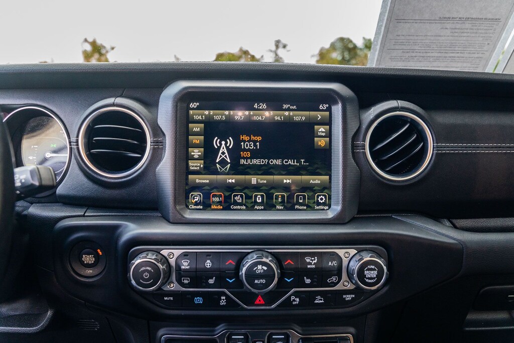 This Wrangler Unlimited Sahara 4xe includes Cold Weather Group (Heated Front Seats, Heated Steering Wheel, and Remote Start System), Quick Order Package 29P, Safety Group (Blind Spot & Cross Path Detection and ParkSense Rear Park Assist System), 2.0L I4 DOHC, 3.73 Rear Axle Ratio, 4-Wheel Disc Brakes, 9 Speakers, ABS brakes, Air Conditioning, Alloy wheels, AM/FM radio, Anti-Spin Differential Rear Axle, Apple CarPlay/Android Auto, Auto-dimming Rear-View mirror, Automatic temperature control, Brake assist, Compass, Delay-off headlights, Driver door bin, Driver vanity mirror, Dual front impact airbags, Dual front side impact airbags, Electronic Stability Control, Emergency communication system: SiriusXM Guardian, Front anti-roll bar, Front Bucket Seats, Front Center Armrest w/Storage, Front dual zone A/C, Front fog lights, Front reading lights, Fully automatic headlights, Garage door transmitter, Heated door mirrors, Illuminated entry, Integrated roll-over protection, Leather Shift Knob, Leather steering wheel, Leather Trimmed Seats w/Sahara Logo, Leather Wrapped Park Brake Handle, Low tire pressure warning, Navigation System, Occupant sensing airbag, Outside temperature display, Panic alarm, ParkView Rear Back-Up Camera, Passenger door bin, Passenger vanity mirror, Power door mirrors, Power steering, Power windows, Premium Tan Sunrider Soft Top, Radio data system, Radio: Uconnect 4C Nav w/8.4" Display, Rear anti-roll bar, Rear reading lights, Rear seat center armrest, Remote keyless entry, Remote Proximity Keyless Entry, Security system, Speed control, Split folding rear seat, Sport Suspension, Steering wheel mounted audio controls, Tachometer, Telescoping steering wheel, Tilt steering wheel, Traction control, Trip computer, Variably intermittent wipers, Voltmeter, and Wheels: 20" x 8" Fully Painted Aluminum . While every effort has been made to ensure display of accurate data, the vehicle listings within this web site may not reflect all accurate vehicle items. All Inventory listed is subject to prior sale. The vehicle photo displayed may be an example only. Pricing throughout the web site does not include any options that may have been installed at the dealership. Please see the dealer for details. Vehicles may be in transit or currently in production. Some vehicles are shown with optional equipment. See the actual vehicle for complete accuracy of features, options & pricing. Because of the numerous possible combinations of vehicle models, styles, colors and options, the vehicle pictures on this site may not match your vehicle exactly; however, it will match as closely as possible. Some vehicle images shown are stock photos and may not reflect your exact choice of vehicle, color, trim and specification. Not responsible for pricing or typographical errors. Virtual Inventory, Available Configurations and In-Transit inventory contains vehicles that have not actually been manufactured. These vehicles show consumers sample vehicles that may be available. Pricing, Options, Color, and other data pertaining to these vehicles are provided for example only. All information pertaining to these vehicles should be independently verified through the dealer.