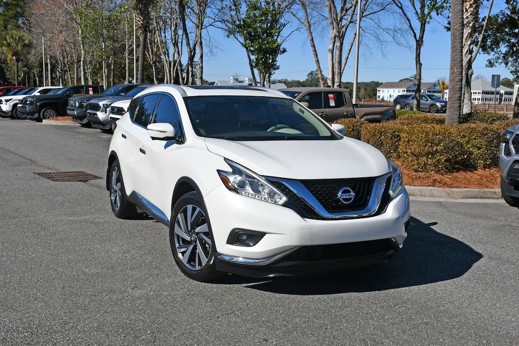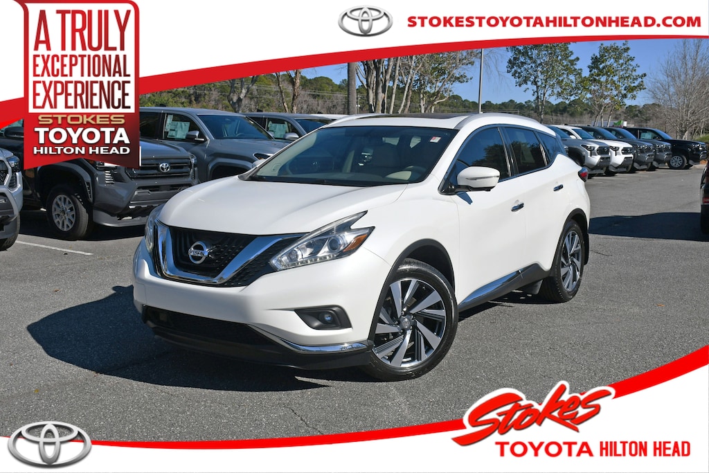***Stokes Toyota Hilton Head*** 2015 Nissan Murano Platinum in Pearl White, Factory Equipped With: Bose Sound System, Leather Seats, Power Windows, Power Locks, Cruise Control, Remote Keyless Entry, 8-Way Power Drivers Seat, Panormaic Sunroof, Alloy Wheels, Heated Leather, 11 Speakers, 4-Wheel Disc Brakes, ABS brakes, Air Conditioning, AM/FM radio, Automatic temperature control, Front Bucket Seats, Heated door mirrors, Intelligent Cruise Control, Low tire pressure warning, Navigation System, Panic alarm, Platinum Technology Package, Power door mirrors, Power driver seat, Power Liftgate, Power Panoramic Moonroof, Power steering, Power windows, Predictive Forward Collision Warning (PFCW), Rear window wiper, Variably intermittent wipers, Wheels: 20" Machined Aluminum-Alloy.