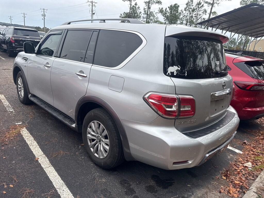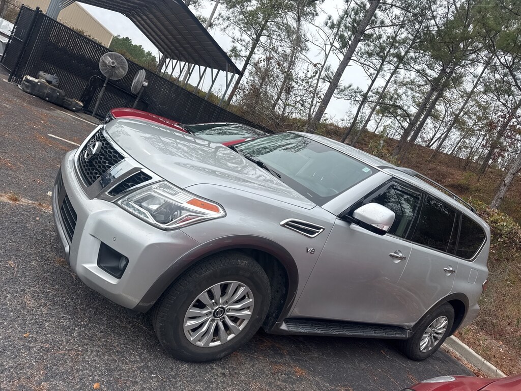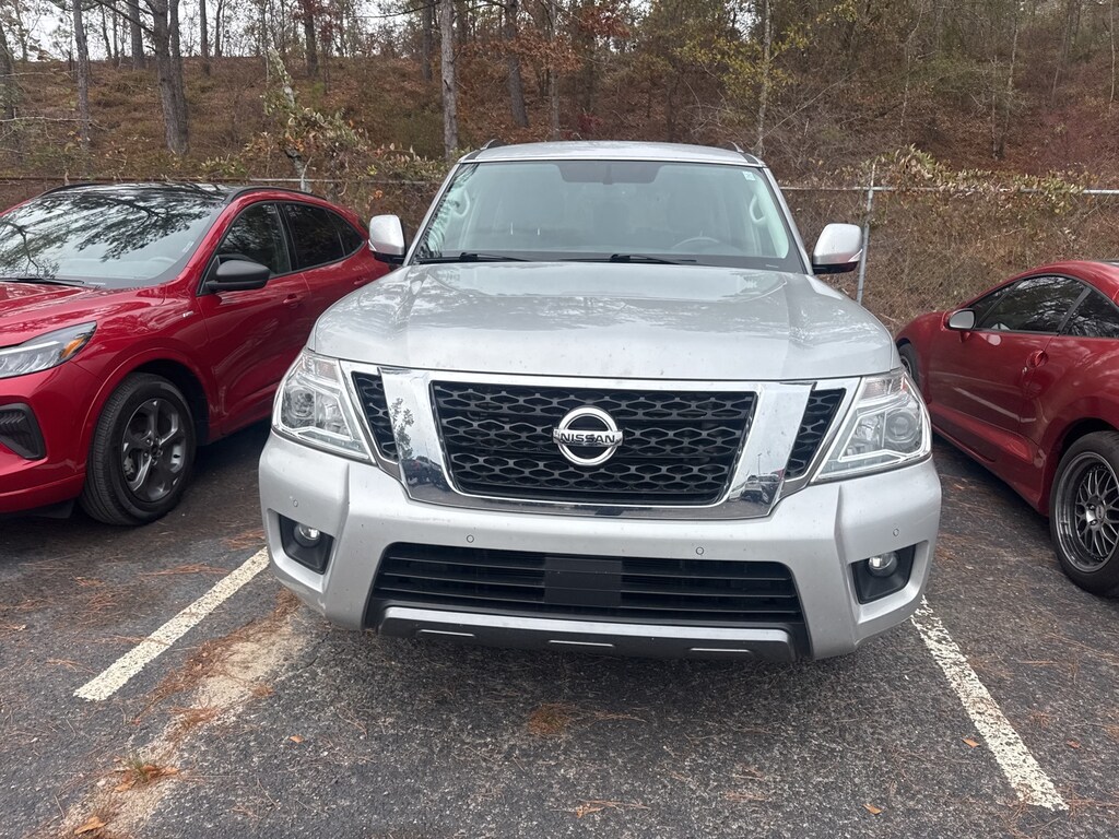 This vehicle comes equipped with Driver Package (Auto-Dimming Interior Rear-View Mirror, Front Fog Lights, Power 60/40 3rd Row Seat, Power Lift Gate, and Trailer Towing Harness), 13 Speakers, 18" Alloy Wheels, 3rd Row Carpeted Floor Mats - Bench Seat, 3rd row seats: split-bench, 4-Wheel Disc Brakes, ABS brakes, Air Conditioning, Alloy wheels, AM/FM radio: SiriusXM, Anti-whiplash front head restraints, Auto-leveling suspension, Automatic temperature control, Axle Ratio: 2.94, Brake assist, Bumpers: body-color, CD player, Cloth Seat Trim, Delay-off headlights, Driver door bin, Driver vanity mirror, Dual front impact airbags, Dual front side impact airbags, DVD-Audio, Electronic Stability Control, Emergency communication system: NissanConnect Services, Four wheel independent suspension, Front anti-roll bar, Front Bucket Seats, Front Center Armrest, Front dual zone A/C, Front reading lights, Fully automatic headlights, Heated door mirrors, Heated Front Bucket Seats, Heated front seats, Illuminated entry, Leather Shift Knob, Low tire pressure warning, Navigation System, Occupant sensing airbag, Outside temperature display, Overhead airbag, Overhead console, Panic alarm, Passenger door bin, Passenger vanity mirror, Power door mirrors, Power driver seat, Power passenger seat, Power steering, Power windows, Radio data system, Radio: AM/FM/SXM/CD/MP3/HD, Rear air conditioning, Rear anti-roll bar, Rear reading lights, Rear seat center armrest, Rear window defroster, Rear window wiper, Reclining 3rd row seat, Remote keyless entry, Security system, Speed control, Speed-sensing steering, Speed-Sensitive Wipers, Split folding rear seat, Spoiler, Steering wheel mounted audio controls, Tachometer, Telescoping steering wheel, Tilt steering wheel, Traction control, Trip computer, Turn signal indicator mirrors, Variably intermittent wipers, and Voltmeter.